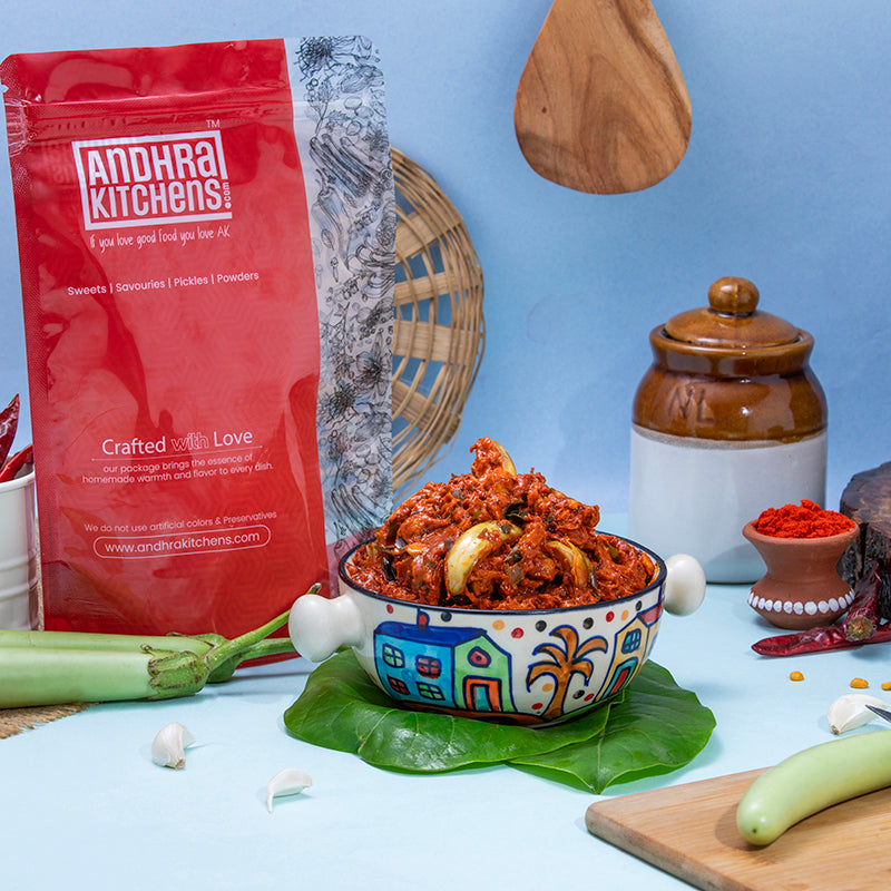 Brinjal Pickle reflects the rustic, fiery, and aromatic essence of Andhra cuisine, making it a favorite for pickle lovers who enjoy strong and authentic tastes.